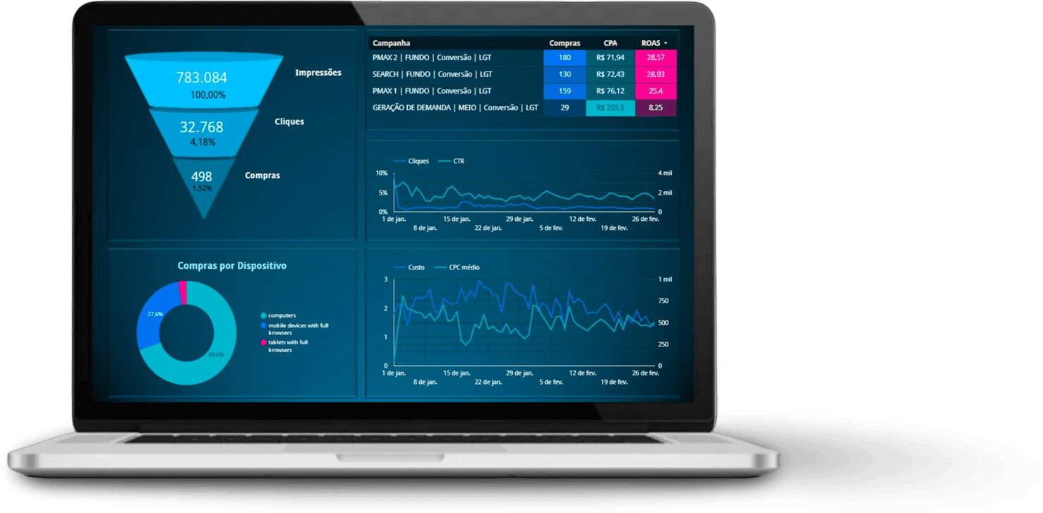 Desenvolvimento, gestão e otimização contínua de campanhas em plataformas como Meta Ads e Google Ads com foco em ROAS. Monitoramento de performance, ajustes estratégicos e escalonamento progressivo para garantir um fluxo constante de leads qualificados com custo de aquisição controlado.